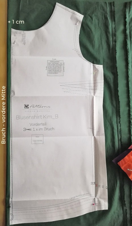 - Zuschnitt: alle Schnittteile wie gehabt – also auch der Beleg nur das Vorderteil wird in der Vorderen Mitte 1 cm erweitert (insgesamt also 2 cm), indem Du es mit 1 cm Abstand vom Bruch auflegst.