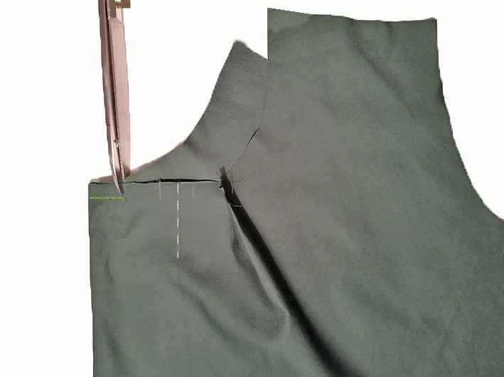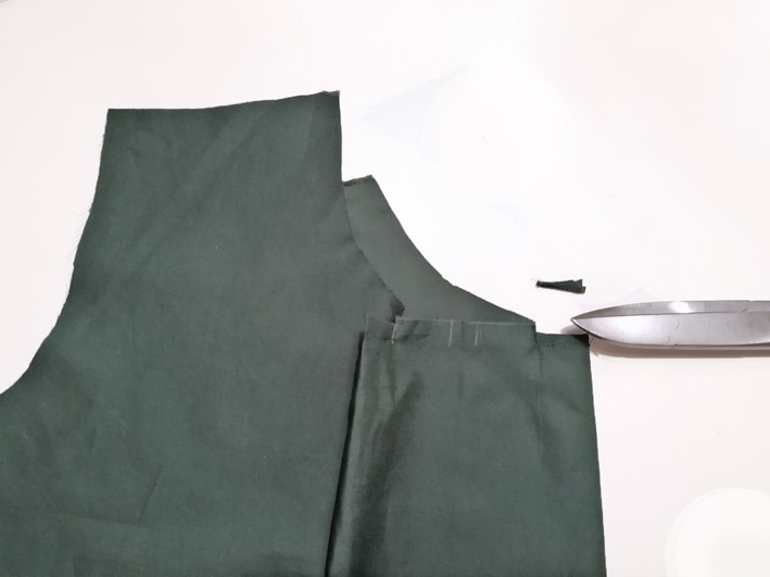 5. Schneide beim Nahtbeginn in die Nahtzugabe bis knapp vor die Naht (1-2 Fäden oder 1-2 mm nicht durchschneiden). Die Nahtzugabe wird im Faltenbereich auf 0,5 cm gekürzt.