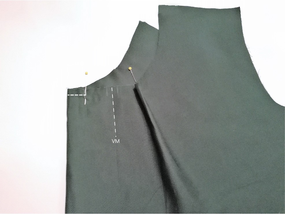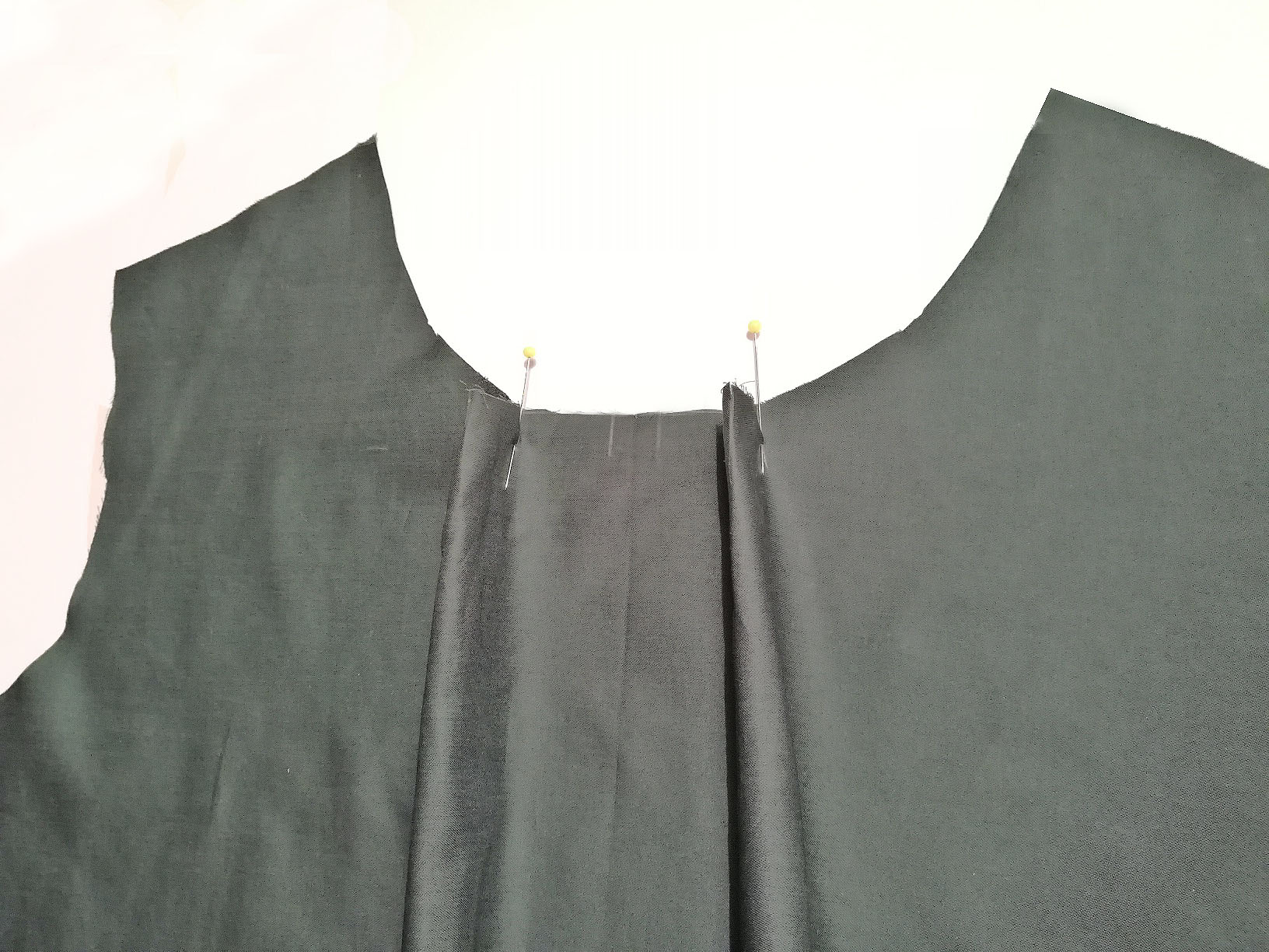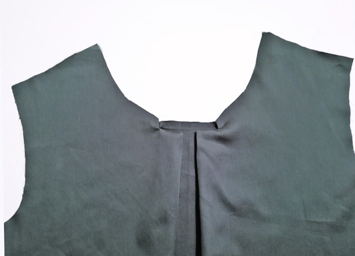 6. Wende nun die Falte auf rechts. Die Falten stehen am Vorderteil ab und sind oben zugenäht. Wenn nötig gleichst Du die Halslinie durch Auflegen des Schnittmusters aus.