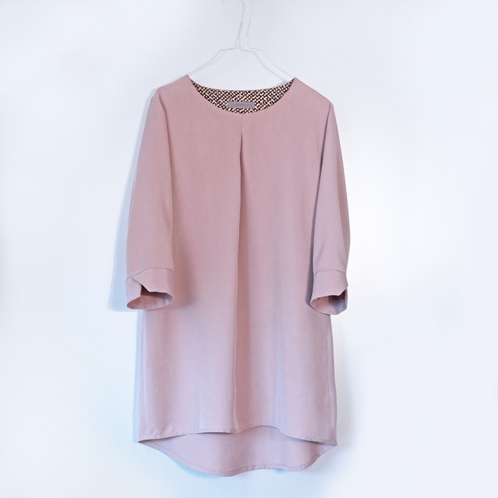 Das Ausgangsschnittmuster ist Schnittmuster Blusenshirt Kim_B . Ein Schnittmuster, dass wir vor einem Jahr entwickelt haben und das sich bei meinen geschätzten Kundinnen übers ganze Jahr großer Beliebtheit erfreut. Es ist erhältlich in denGrößen 32-48 . Ab Größe 42 enthält das Schnittmuster einen Brustabnäher für die optimale Passform. Auch das Material ist besonders: Es ist ein Baumwollsatin in Bio-Qualität von Siebenblau. Ein wunderbarer Stoff mit dezentem Schimmer, den es auch noch in anderen Farben gibt.