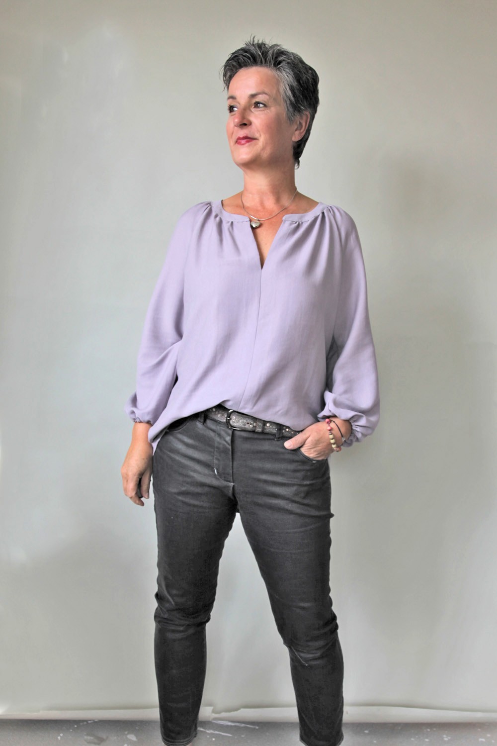 Die völlig verschlusslose Bohobluse wird anstatt aus Webware aus Jersey genäht und den nicht ganz einfach zu nähenden Formbeleg am Halsausschnitt habe ich durch ein sehr viel einfacher zu nähendes Bindeband ersetzt.