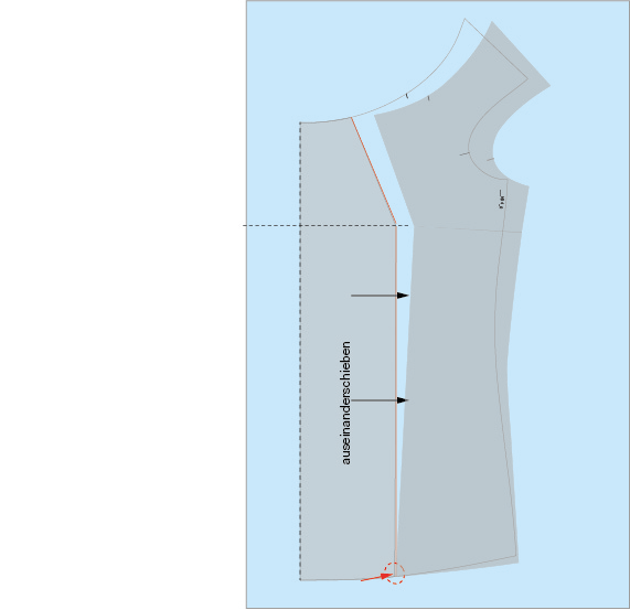 Schiebe die längs durch das Teil verlaufende Linie vorsichtig auseinander und zwar genau um das bei Schritt 1 errechnete Maß (z. B: 2 cm – genau an der Brustlinie). Gleiche die Halslochlinie aus. Das wars schon. Umrande nun die neue Kontur und schneide Dein neues erweitertes Vorderteil aus. Das ging doch wirklich fix, oder?