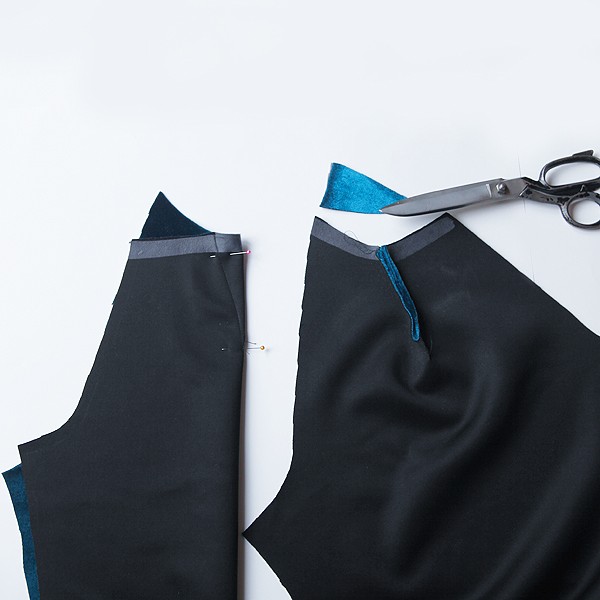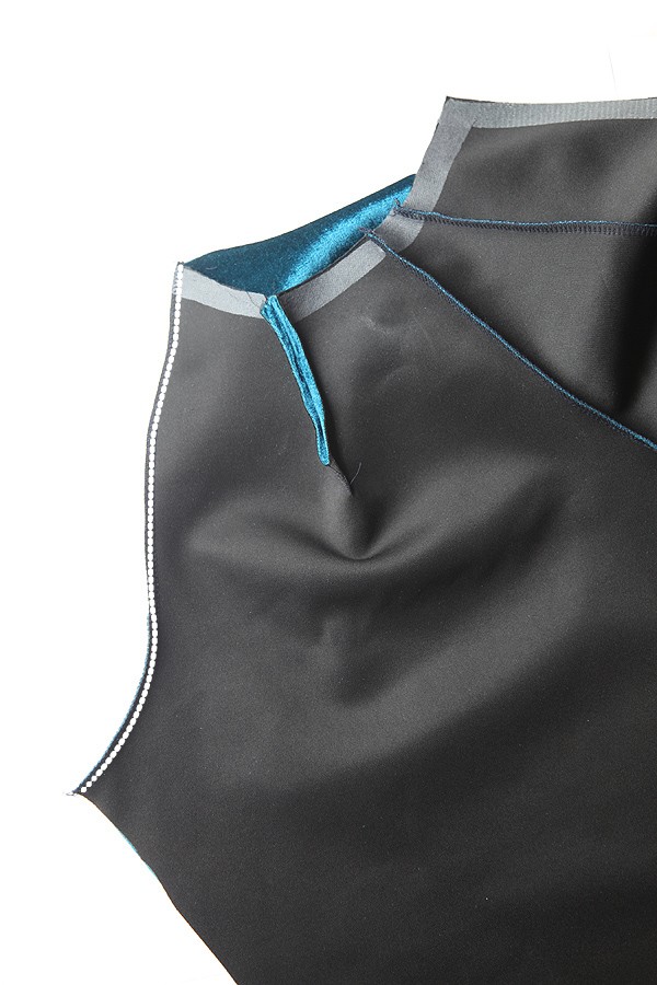 Nähe den Abnäher an der Kante beginnend mit feiner Spitze aus (Geradstich) und verknote die Enden oder vernähe sie. Bei dicken Materialien den Abnäherinhalt wegschneiden und den Abnäher flach auseinanderbügeln und wenn nötig auch versäubern. Ansonsten den Abnäher flach zum hinteren Armloch bügeln.