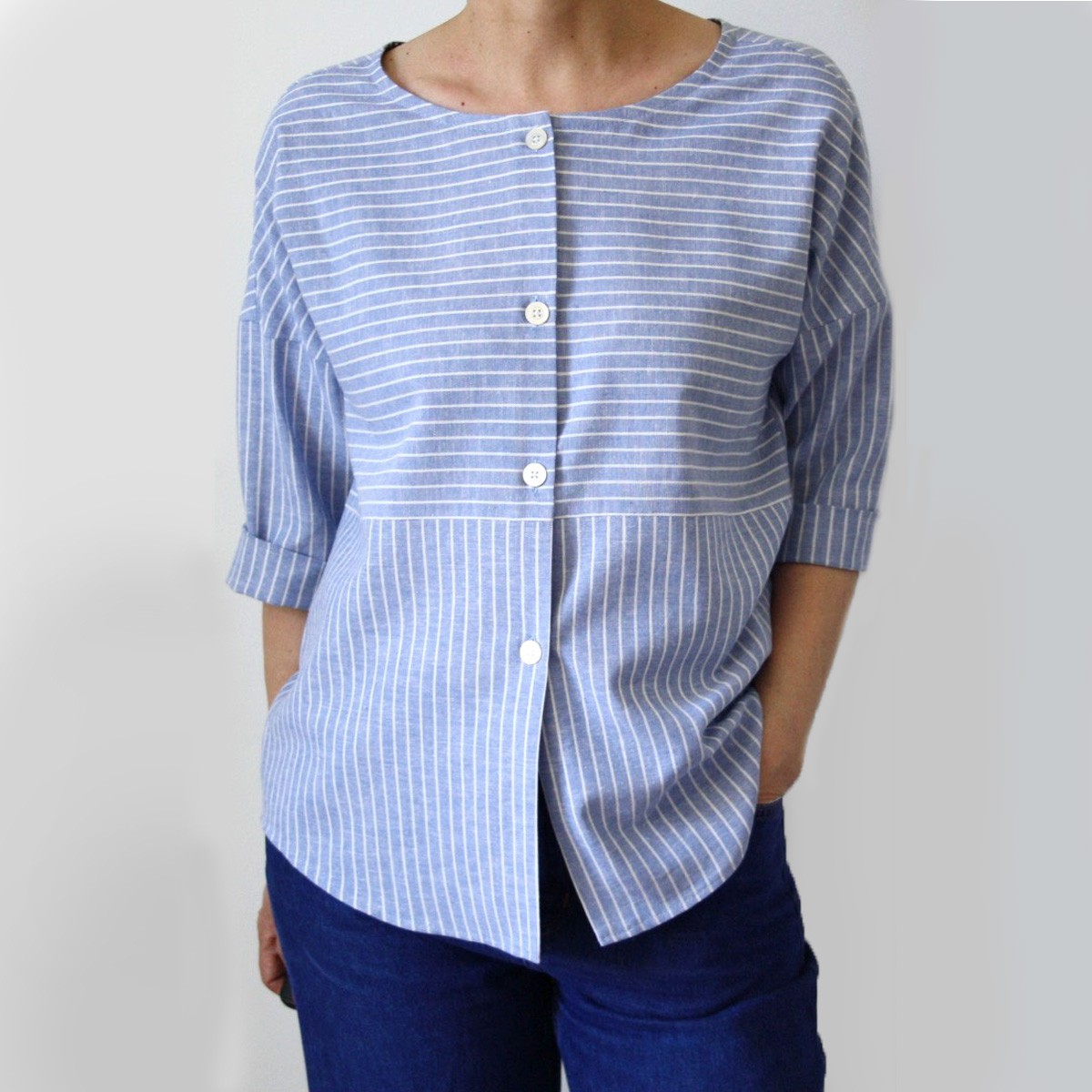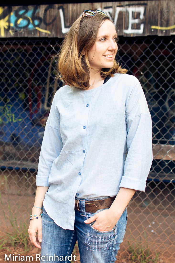 *Wer genau schaut, sieht das mein Halsloch durch einen Schrägstreifen verkleinert wurde, das ist aber nicht nötig. Man kann es wie gesagt einfach verkleinern. Leider habe ich das beim Zuschnitt vergessen und mußte es dann auf diese Weise lösen. Es war dadurch einigermaßen schwierig das oberste Knopfloch zu nähen und es hat eigentlich zuwenig Platz. Aber durch die kleinen Knöpfe habe ich es gerade noch hinbekommen.