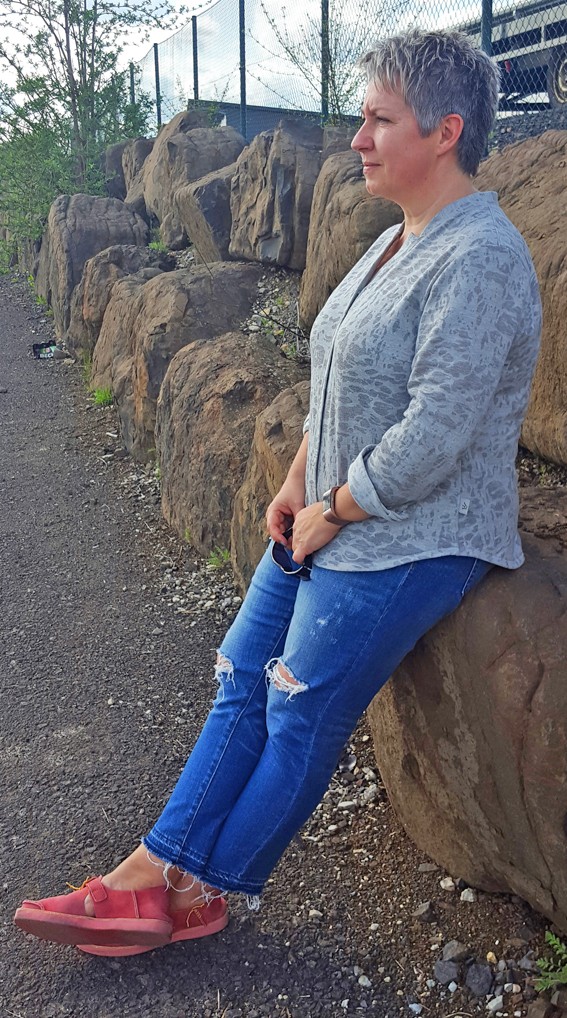 Supertoller Schnitt, vor allem der Kragen, sehr angenehm durch den T-Shirtstoff. Ich musste die für mich üblichen Anpassungen (mehr Hüfte) vornehmen, die Quetschfalte habe ich wegen Rundrückens offen gelassen, passt! Eine Unsicherheit hatte ich bei der Auswahl der Nahtzugabe im Bereich des Kragens…. ich vermute , ich hätte nicht an allen Seiten 0,5 cm zugeben sollen sondern nur an der Seite zum Shirt hin. Geht trotzdem.