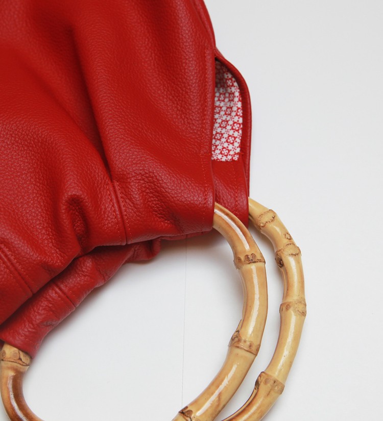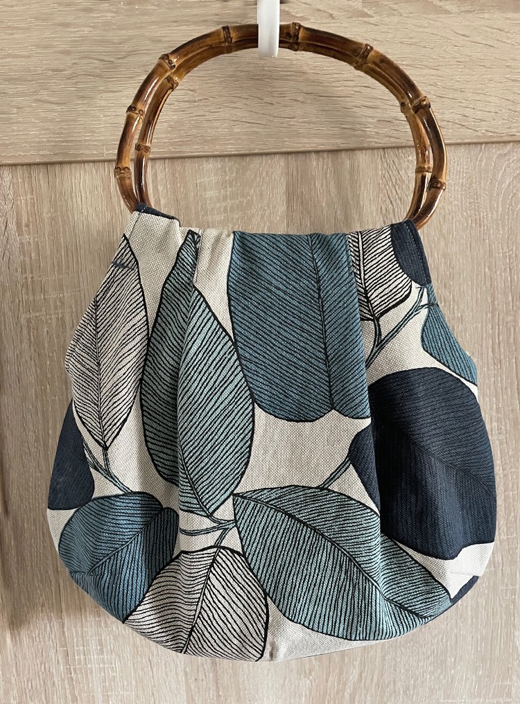 Das Schnittmuster Beuteltasche aus Leder kann mit der Haushaltsnähmaschine genäht werden. Es wird feines Leder verarbeitet (z. B. Babyschuhleder), weil sich das sehr gut verarbeiten lässt. Die Griffe sind aus Bambus. Am gemusterten Futter ist ein Innenfach mit Reißverschluss für wichtige Kleinigkeiten.