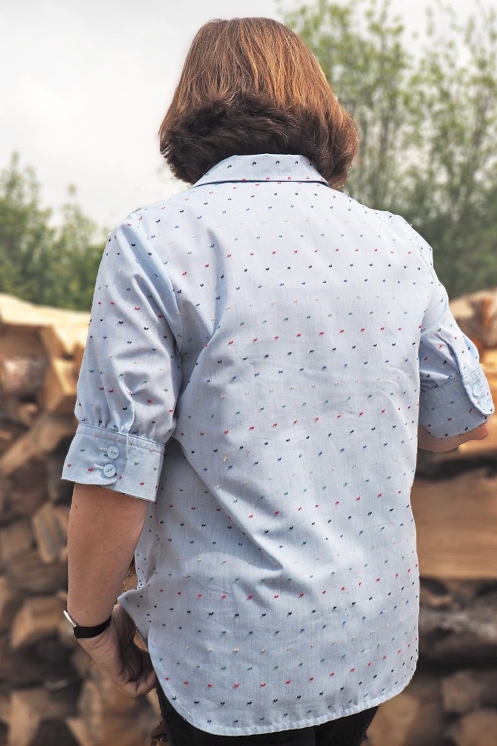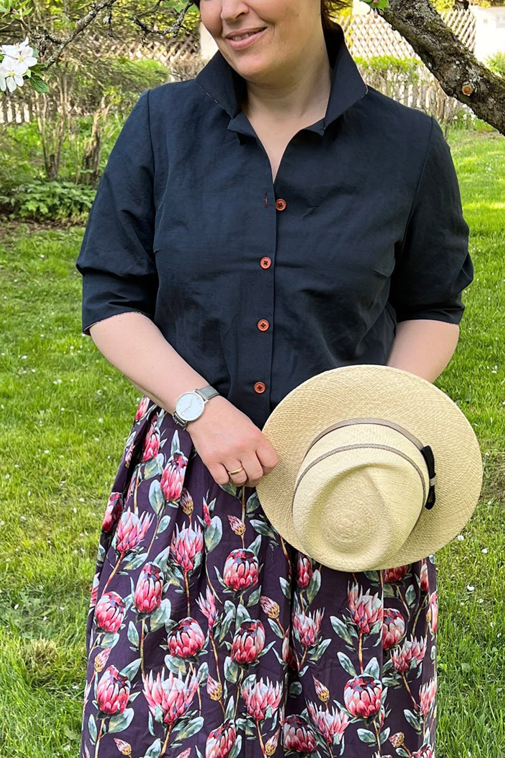 Die Bluse Florence_B ist ein variables Basicteil mit einem besonderen Kragen – einem Auslegekragen oder in Schneidersprache „eingehängtem Kragen“. Alleine drei unterschiedliche Ärmel und zwei Saumlängen stehen zur Auswahl. Somit lässt sich die feminine Bluse – angepasst an die jeweilige Jahreszeit – aus vielen unterschiedlichen Blusenstoffen nähen. Der Body ist schlicht, hat eine bequeme Weite. Wie weit der Kragen geöffnet sein soll, bestimmst Du, durch die Lage des 1. Knopfes.