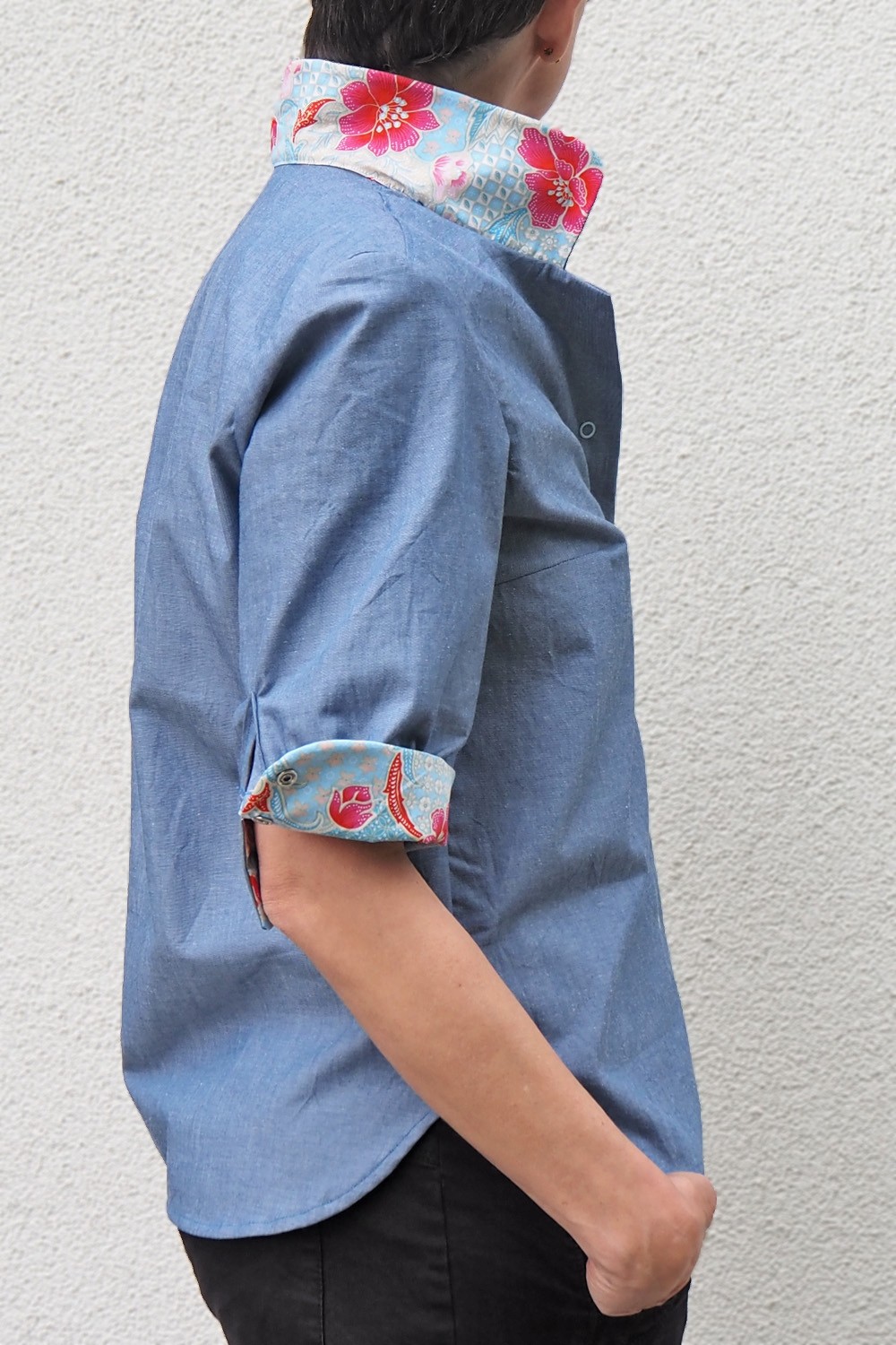 Das ist abhängig von der Variane die Du nähen möchtest. Der Kragen ist einfach zu nähen, er hat keinen Steg. Ganz schnell und einfach ist die Langarmvariante mit Abnäher zu nähen – ganz ohne Schlitz und Manschette. Die Knöpfe können auch durch Druckknöpfe ersetzt werden.