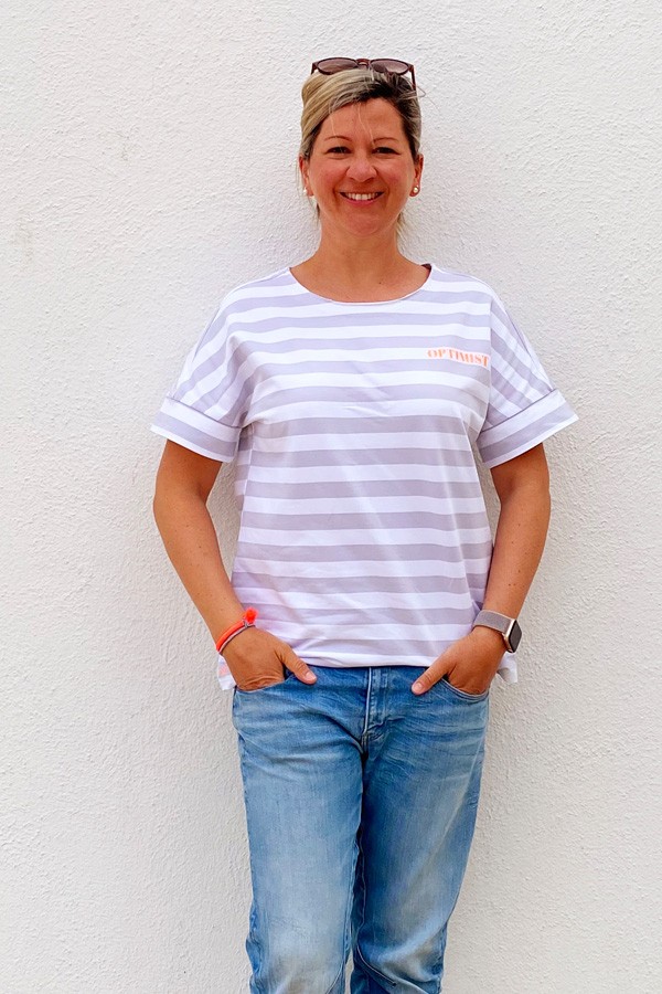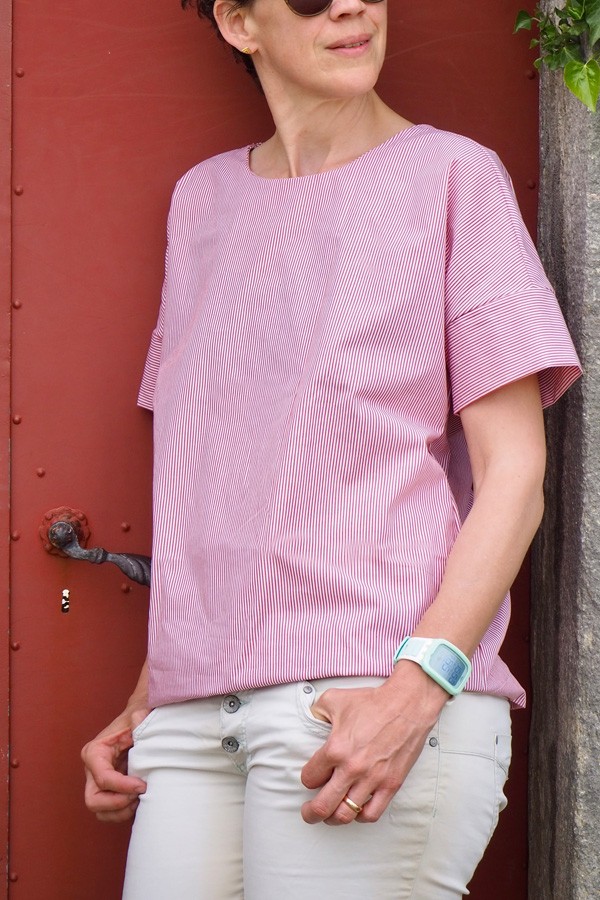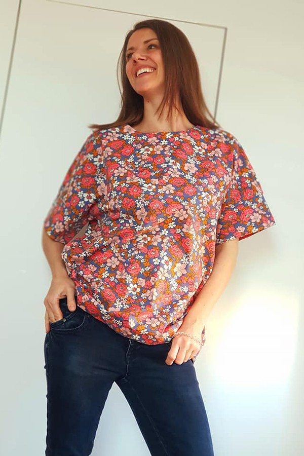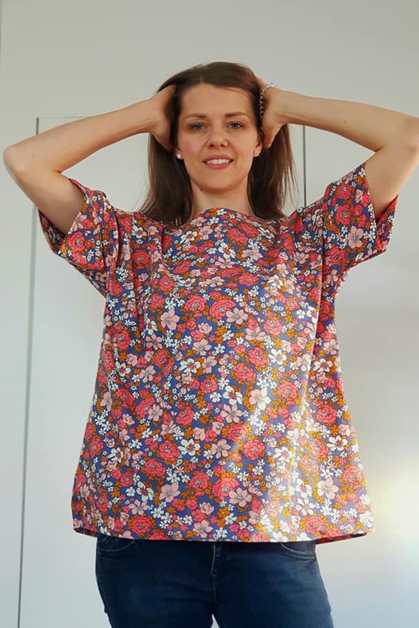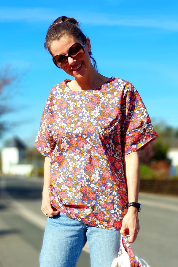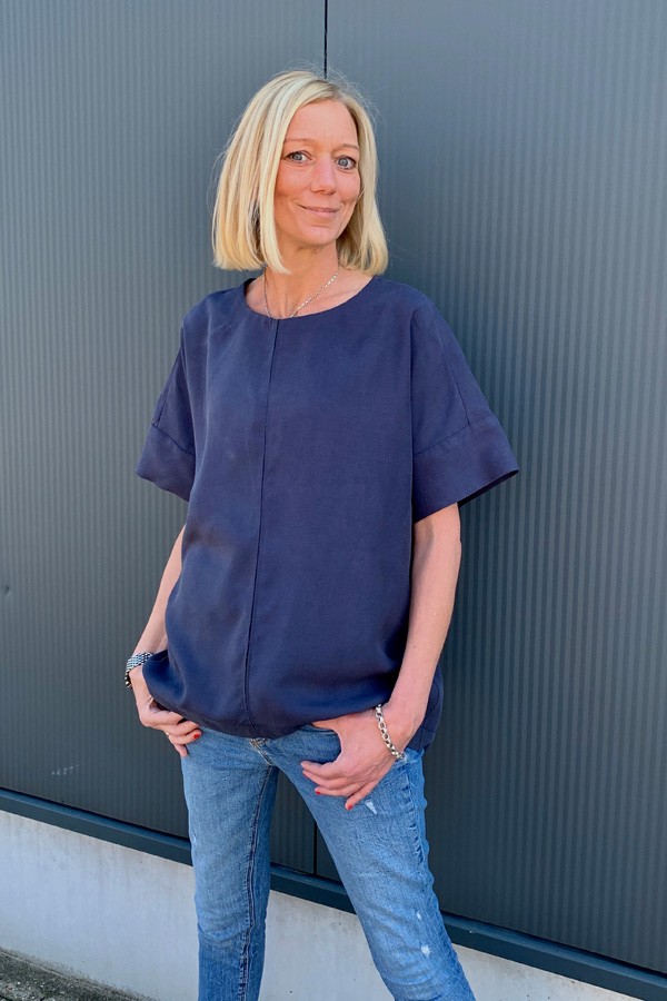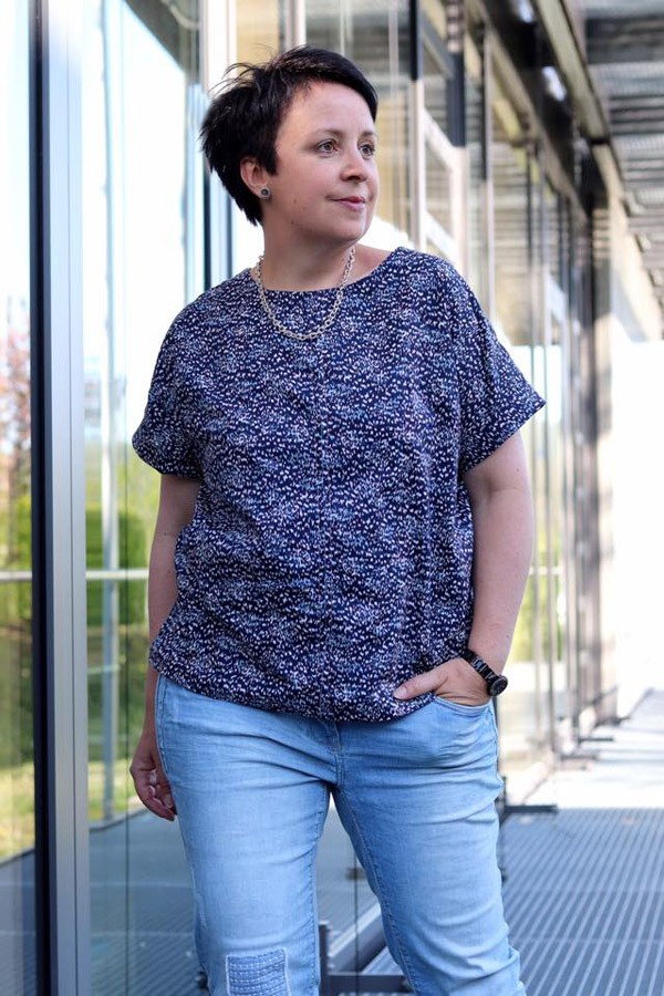 Tolles Schnittmuster, sehr gut erklärt. Ich hatte keine Schwierigkeiten. Ich habe jeweils ein Shirt aus Webware und das erste Mal eins aus Musselin genäht, beides tolle Ergebnisse. Beide Stoffe sind leicht gecrasht, deshalb habe ich mich für die Variante ohne Kellerfalte entschieden. Gefällt mir in diesem Fall von der Optik her besser. Ich habe den Bogenabschluss gewählt und das Shirt noch 5 cm verlängert. Das mache ich aber generell so, kurze Shirts sehen bei mir einfach nicht aus. Meine Kaufgröße ist M, hier habe ich Größe S genäht. Wer es also nicht ganz so oversized mag, dann eine Größe kleiner wählen. Passt perfekt. trotzdem noch schön luftig-locker. Solche Schnittmuster mag ich!