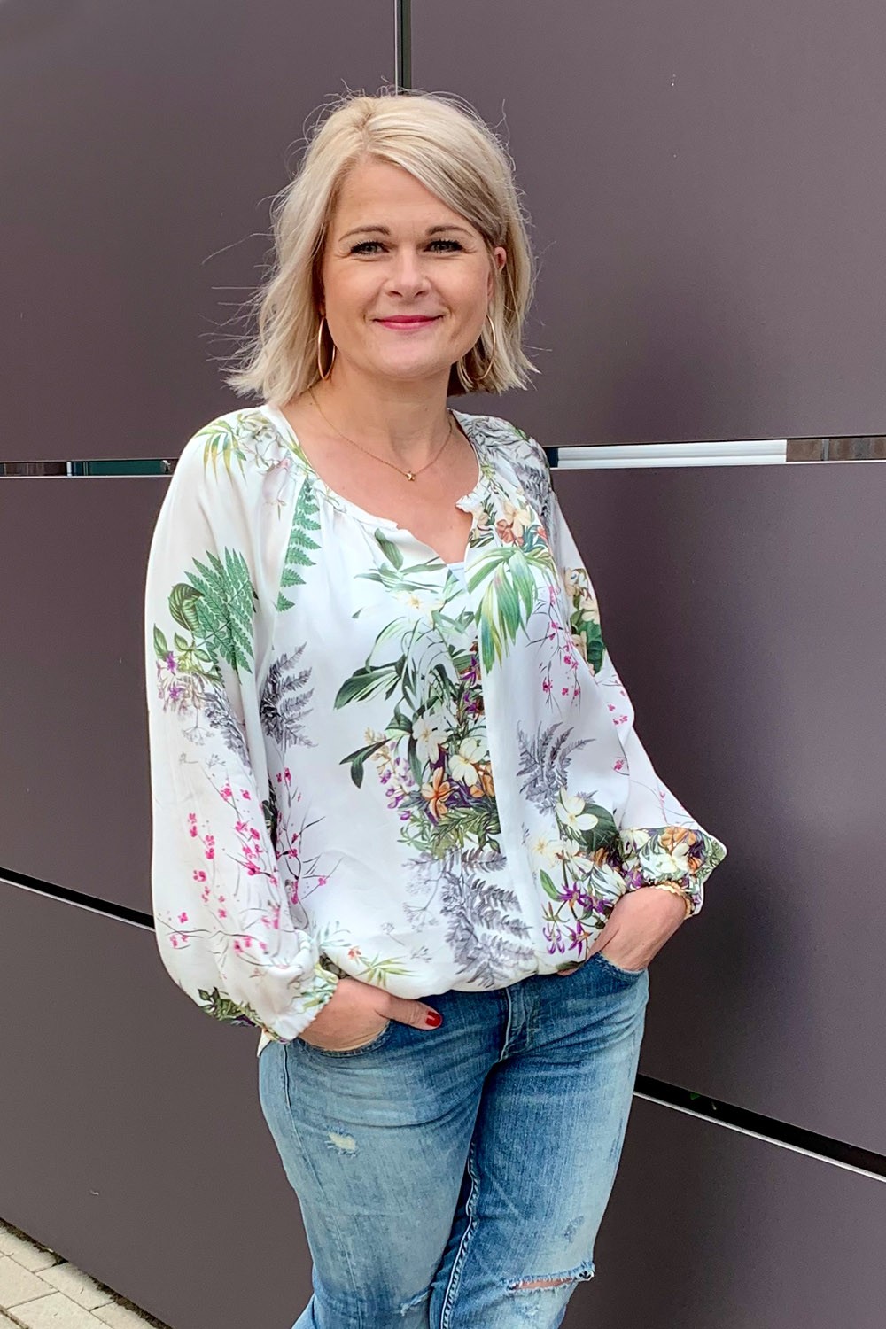 Die Bluse sitzt sehr gut. Die genähte Größe entspricht meiner Kaufgröße. Ein besonderer Vorteil finde ich, dass man nur seine Größe ausdrucken kann. Die Anleitung ist sehr gut verständlich und die Bluse war einfach zu nähen. Nur beim Kragen muss man langsam und sorgfältig arbeiten.