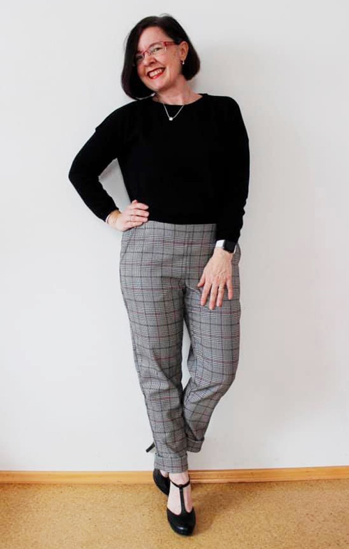 Ich habe zwei Hosen genäht. Eine (ganz zum Relaxen) in Jersey und eine in längselastischem Jacquard mit Glencheckmuster (zum Shoppen und so).