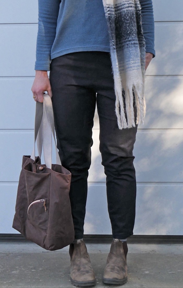 Diese Hose verbindet für mich eine „angezogene“ Optik mit dem bequemen Gefühl einer Schlupfhose. Durch den geteilten Bund fällt der Gummizug nicht ins Auge und mit den Taschen hat man alles, was eine schlichte und bequeme Hose braucht. Mir gefällt das schmale Bein, das auf Knöchelhöhe endet am besten und zum Frühling hin werde ich mir zwei neue aus Jeans nähen.