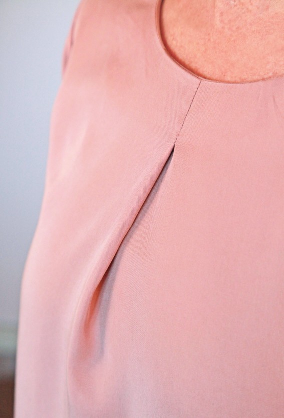 Anstelle von einer Falte wurde hier die Mehrweite einfach eingekräuselt und der Halsausschnitt mit einem Schrägband eingefasst.