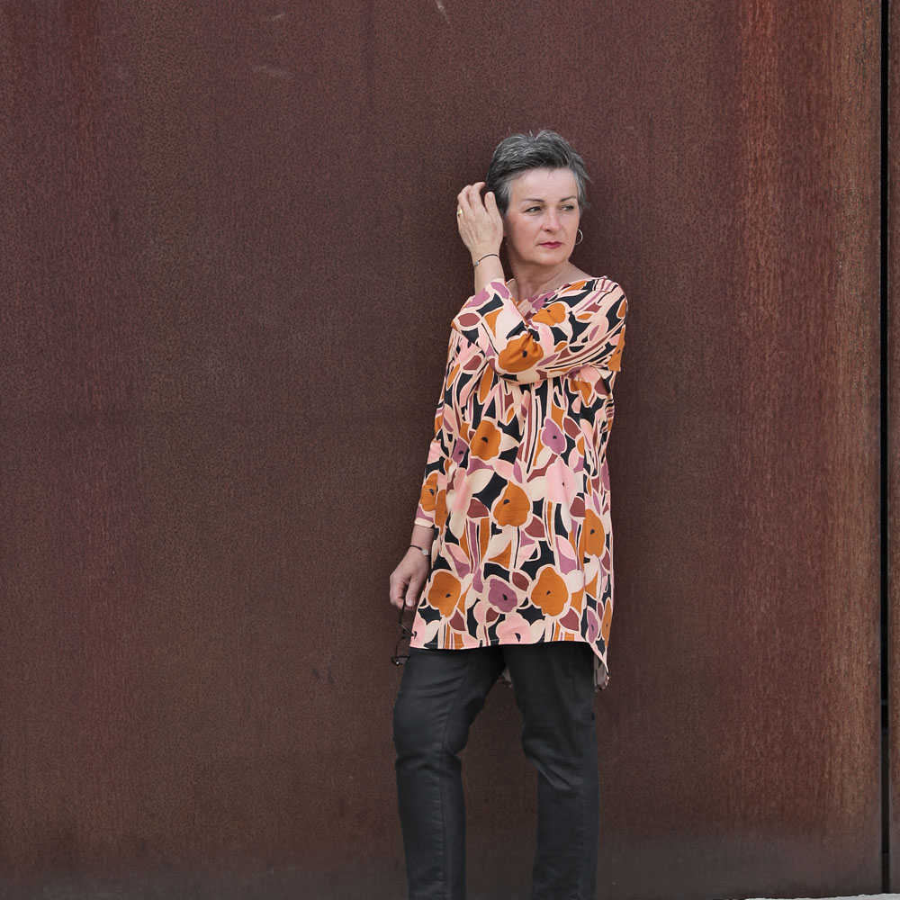 Das Blusenshirt Kim_B ist genauso easy zu tragen, wie es genäht wird. Es läßt sich sehr gut kombinieren und kann aus Jersey oder Webware genäht werden. Das Schnittmuster enthält mehrere Nähvarianten und neben der Normallänge eine Longversion. Anfängergeeignet!