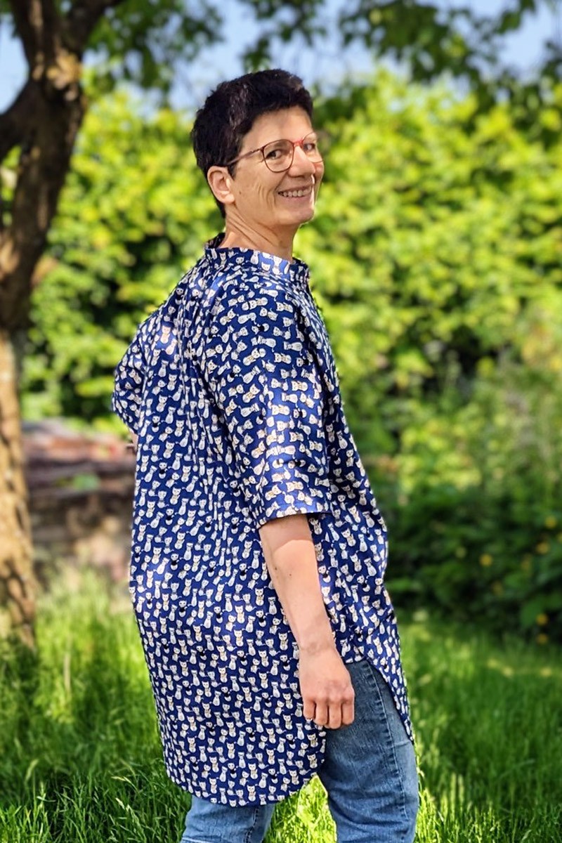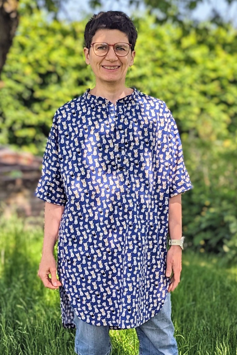 Ein wunderbarer, luftiger Schnitt für heiße Tage! Da ich nur 1,63 m bin, hatte ich Bedenken, dass ich darin „versinke“. Die Bluse sitzt aber wunderbar und ich fühle mich sehr wohl darin. An der Taillenline habe ich die Länge um 5 cm gekürzt. Vernäht habe ich einen flutschigen Viskosestoff, eine Herausforderung beim Nähen, aber die Bluse fällt dadurch sehr schön geschmeidig. Durch die detaillierte Anleitung bin sehr gut mit dem Schnittmuster zurecht gekommen. Klare Empfehlung!