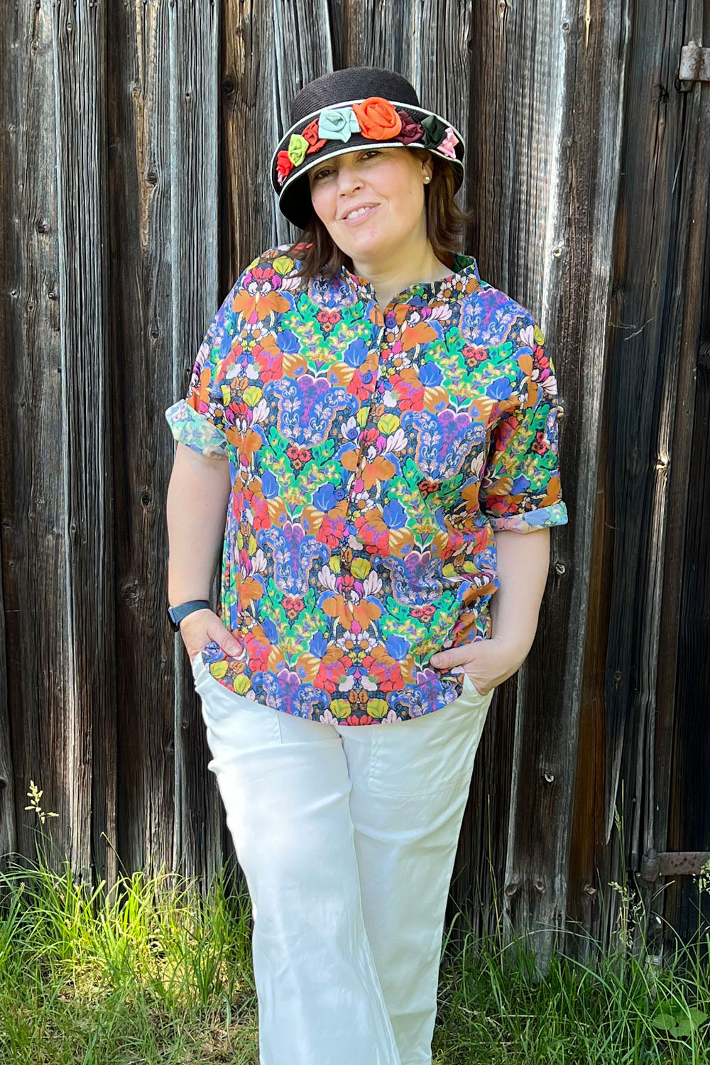 Heute trage ich meine neue Bluse 🙂 Gefällt mir ganz gut! Das Schnittmuster habe ich so umgesetzt: in der Kurzversion Größe S (um 3 cm gekürzt für meine Körpergröße) mit Stehkragen und Pololeiste wie vorgeschlagen, aber mit nur einem Druckknopf.