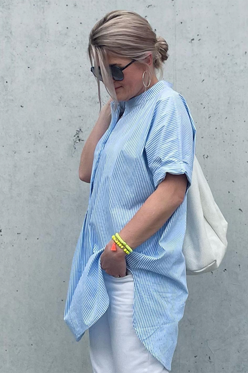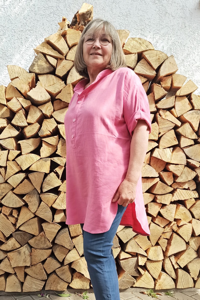 Das Schnittmuster Oversize Bluse Lilia für Damen ist um die Brust und das Gesäß extra leger geschnitten und hat zusätzlich eine leichte A-Form. Es ist eine besonders bequeme und luftige Hemdbluse, die Du in zwei vorgegebenen Längen nähen kannst. Die lange Version eignet sich sehr gut um eine Legging, eine schmale Jeans oder einfach nur eine Shorts drunterzutragen. Eine besondere Ärmellösung sorgt für optimale Bewegungsfreiheit: Ein Kimono mit in der Achsel eingesetztem Drachenkeil. Wenn Du die Arme hochhebst, stehst Du damit trotzdem nicht im Freien. Das ist der große Vorteil dieser Schnittlösung.
