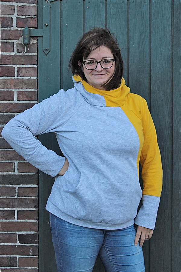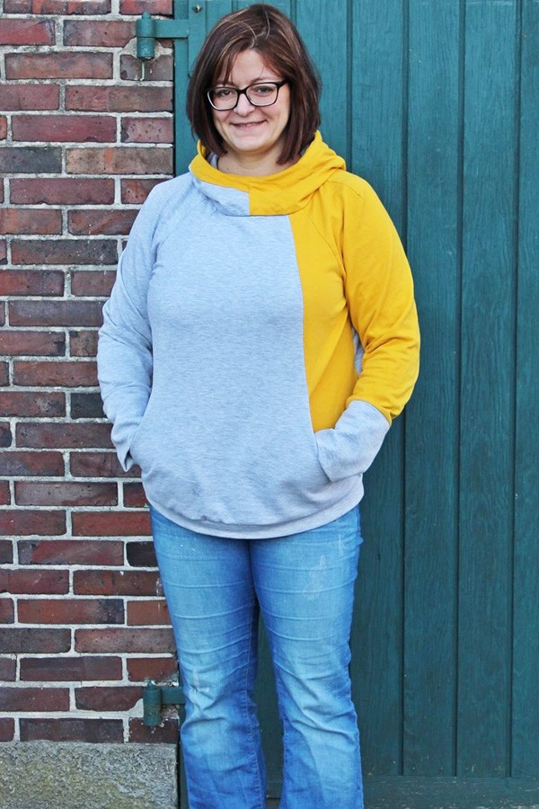 Um den Pullover Kaja_B zu nähen, solltest Du etwas Näherfahrung mitbringen. Die eingearbeitete Tasche ist einfach zu nähen, denn in meiner Nähanleitung erkläre ich Dir Schritt-für-Schritt – unterstützt durch Fotos – wie das Schnittmuster Pullover große Größen genäht wird.