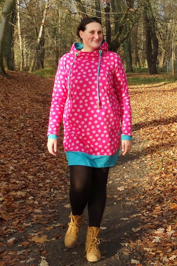 Bei den Nähbeispielen nehmen sich die Probenäherinnen die Freiheit, kleine Änderungen, die ihnen passend erscheinen, vorzunehmen. Das können z. B: Saumbündchen (nicht in der Nähanleitung enthalten), Farbeinteilungen, Längenanpassungen bzw. wie am letzten Foto zu sehen ein Reißverschluss in der vorderen Mitte sein. Das Schnittmuster selber wird in der Grundform nicht geändert. Diese Nähbeispiele sind als Passformmuster und als Inspiration zu sehen.