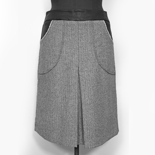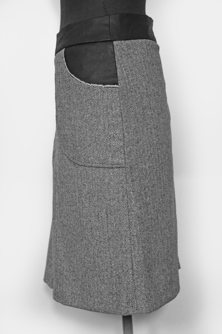 Das im Sommer erschienene Schnittmuster zu Rock Kitti_B ist in seiner Grundform ein Basicrock in leichter A-Linie mit Passe und verschiedenen Taschenvarianten (siehe technische Zeichnung unterhalb). Konzipiert wurde das Schnittmuster für Stoffe mit geringem Elasthananteil bzw. Jeans. Die Idee, welche dem heute gezeigtem Rock zu Grunde liegt ist, zu zeigen, dass Kitti auch aus klassischen Materialien, wie z.B. Wollstoffen nähbar ist. Hier siehst Du also eine Schnittmustervariation von Rock Kitti_B: Mit Kellerfalte und aus Wolltweed ohne jeglichen Elasthananteil.