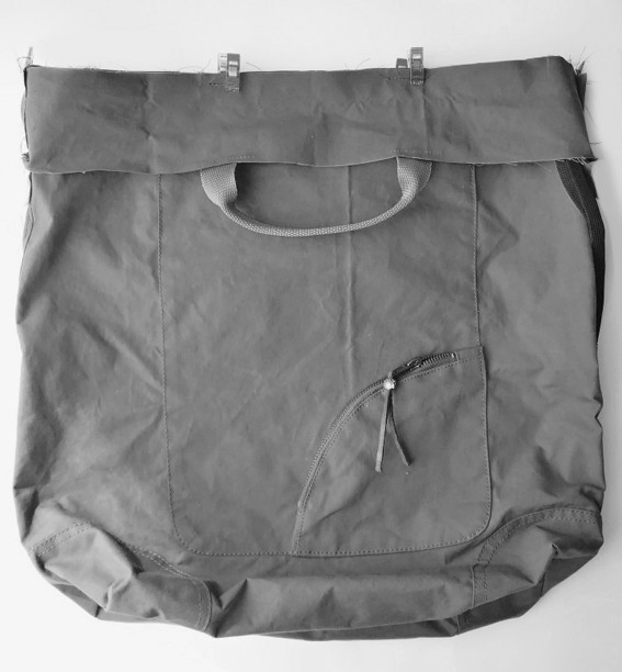 Stecke die Tragegriffe mittig an die Markierung. Die Griffe weisen nach unten. Die Griffnaht weist zum Beleg. Innerhalb der Nahtzugabe feststeppen – am Besten mit Doppelnaht. Die Halterung für die Halbringe (restliches Gurtband halbiert) wird seitlich an die Belegoberkante gesteppt.