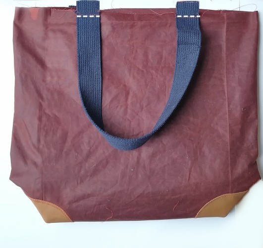 TIPP: Es wäre zu überlegen, ob man den kompletten Kantenbeleg, BEVOR man ihn zusammennäht, mit einer Einlage beklebt. Es würde den Stoff an der Stelle der Griffe und des Gurtbandes verstärken. Ich habe das bei keiner meiner Taschen gemacht und bislang keine Probleme. Aber eine der Mitnäherinnen hat mir erzählt, dass bei ihr bei einer anderen Tasche aus Oilskin (es war wohl kein Dryoilskin) die Gurte ausgerissen sind. Ich denke, das wäre eine gute Idee.
